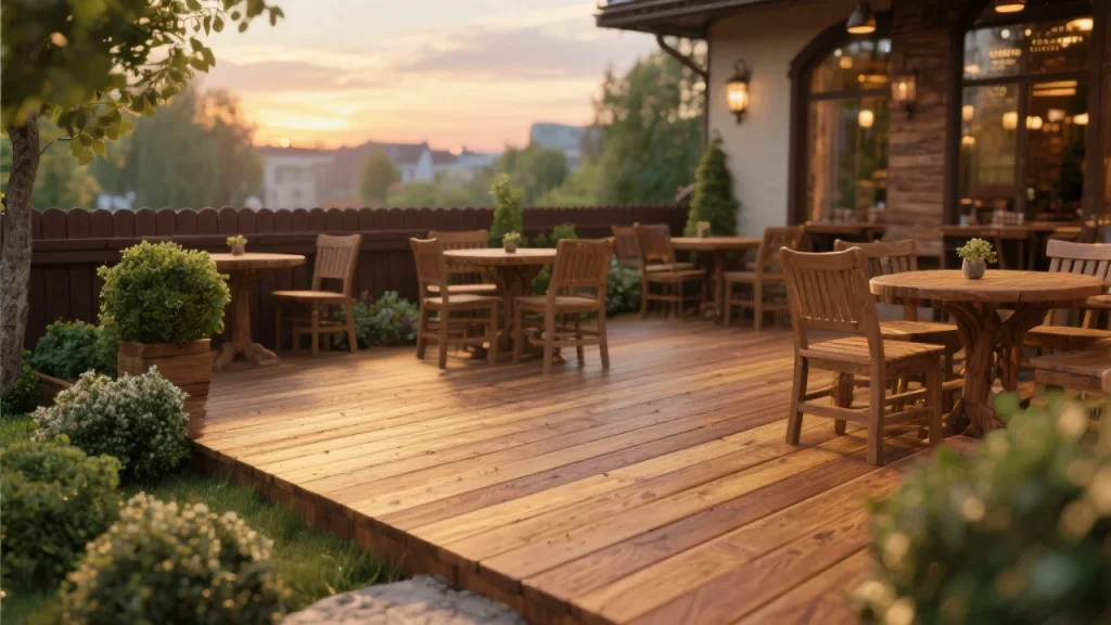 Для ресторана в Белгороде мы сделали настил из террасной доски Iron Decking в оттенке Кедр. Заведение специализируется на семейных обедах и торжественных мероприятиях, поэтому площадка должна быть максимально надёжной, безопасной и долговечной.